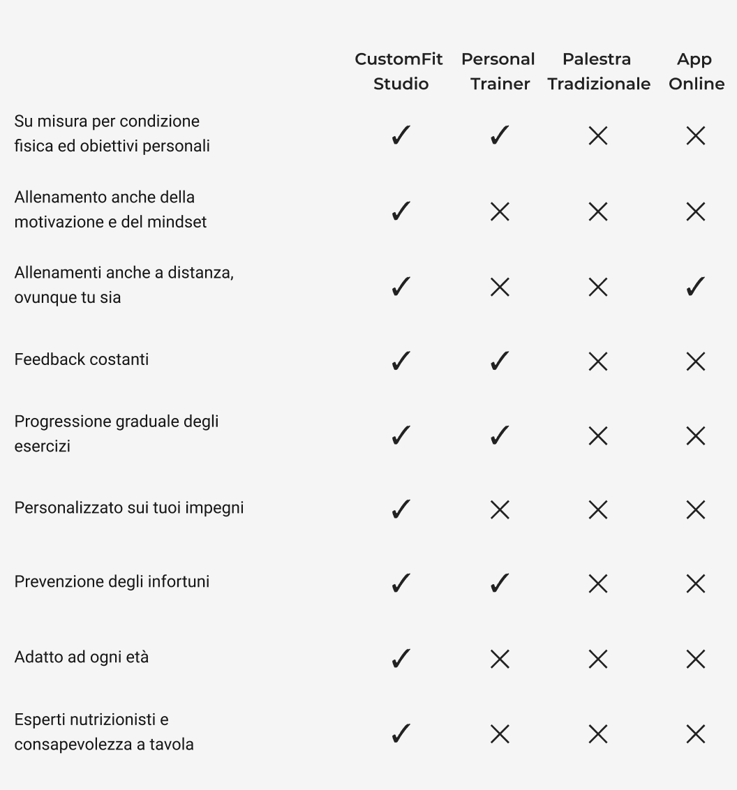 | Su misura per condizione fisica ed obiettivi personali | ✓ | ✓ | ✗ | ✗ |